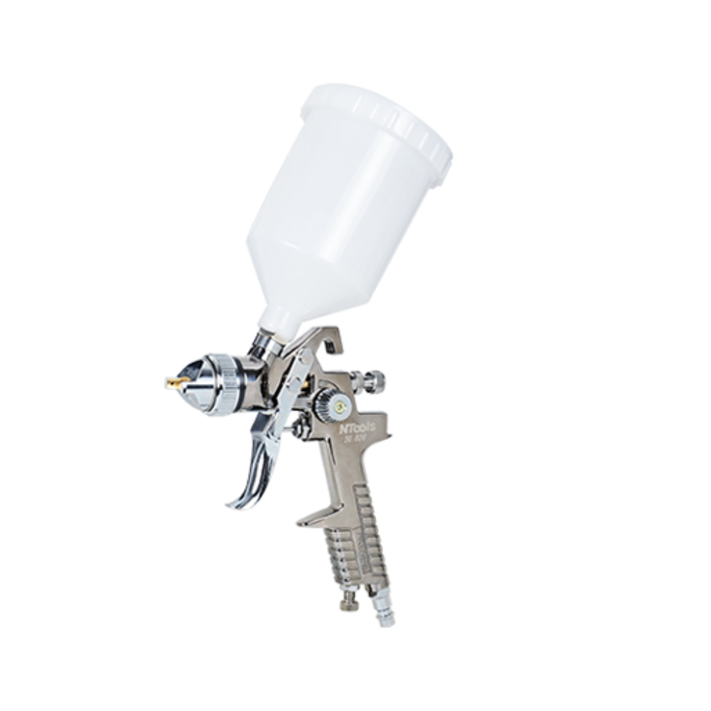 Scopri la pistola a spruzzo professionale NTools SG 828 HVLP con tazza superiore in nylon, ideale per applicare fondi, primer, smalti acrilici, poliuretanici e trasparenti con precisione e versatilità.