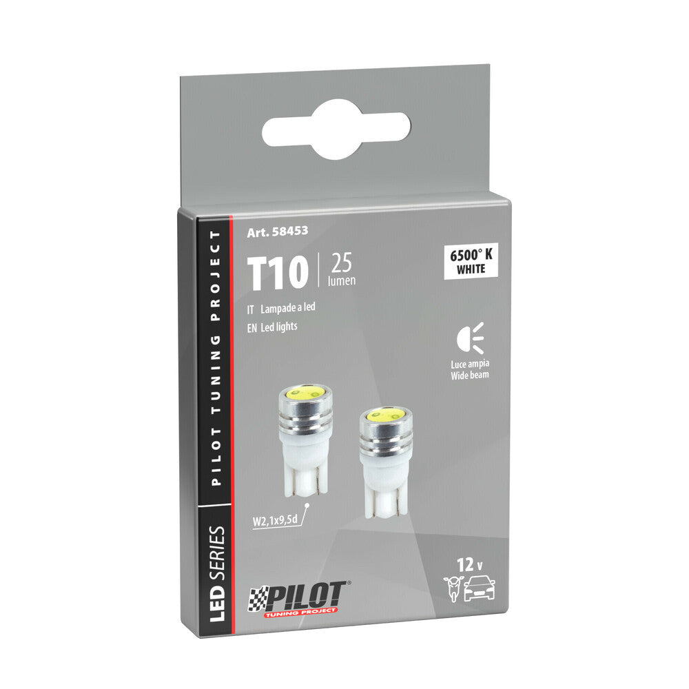 Realizzate con materiali di alta qualità, le lampadine hanno dimensioni compatte di 12x24 mm che le rendono adatte a spazi ristretti. Il tipo base W2,1x9,5d (T10) garantisce compatibilità con molti alloggiamenti standard. La doppia polarità permette un'installazione semplice senza preoccuparsi del verso di inserimento. Le lampadine sono confezionate in scatola da 2 pezzi, ideali per sostituzioni rapide e affidabili.