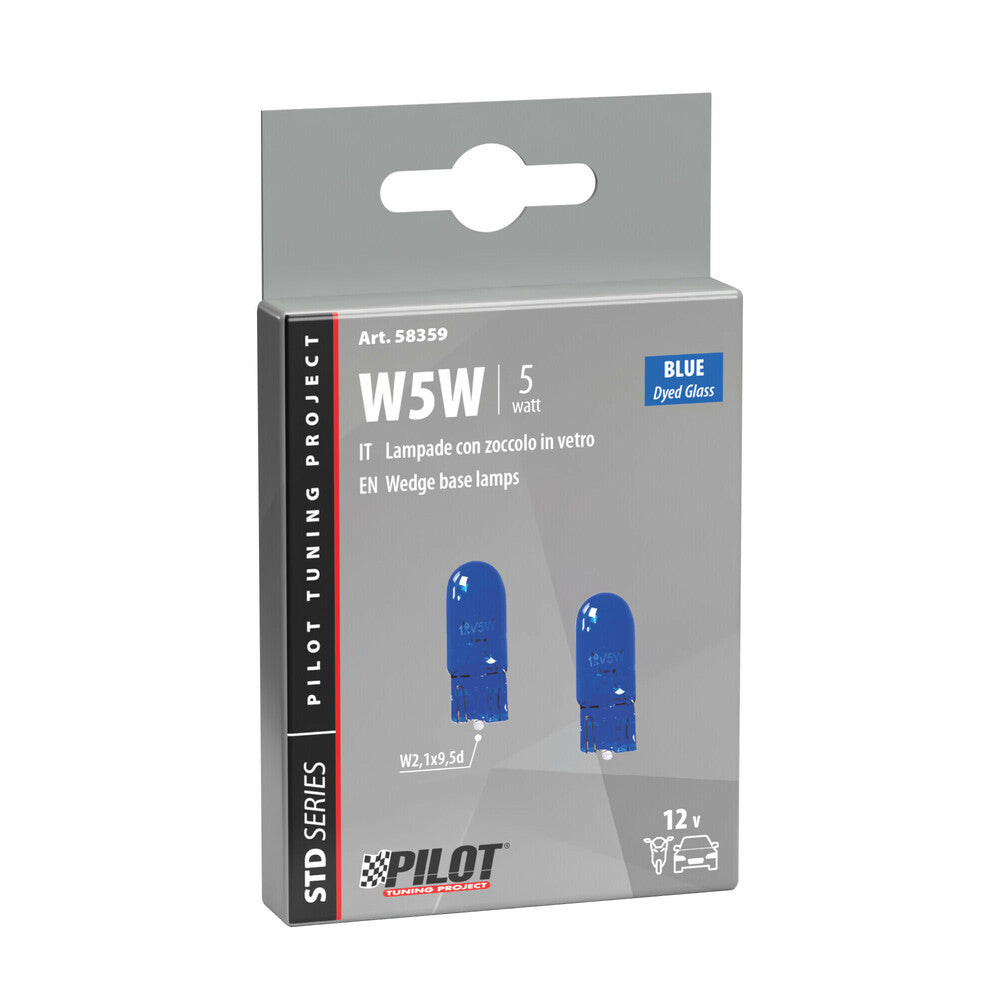 La lampada 12V W5W con zoccolo in vetro tinto blu garantisce una luce bianca ancora più intensa e brillante, ideale per migliorare la visibilità e lo stile del tuo veicolo.