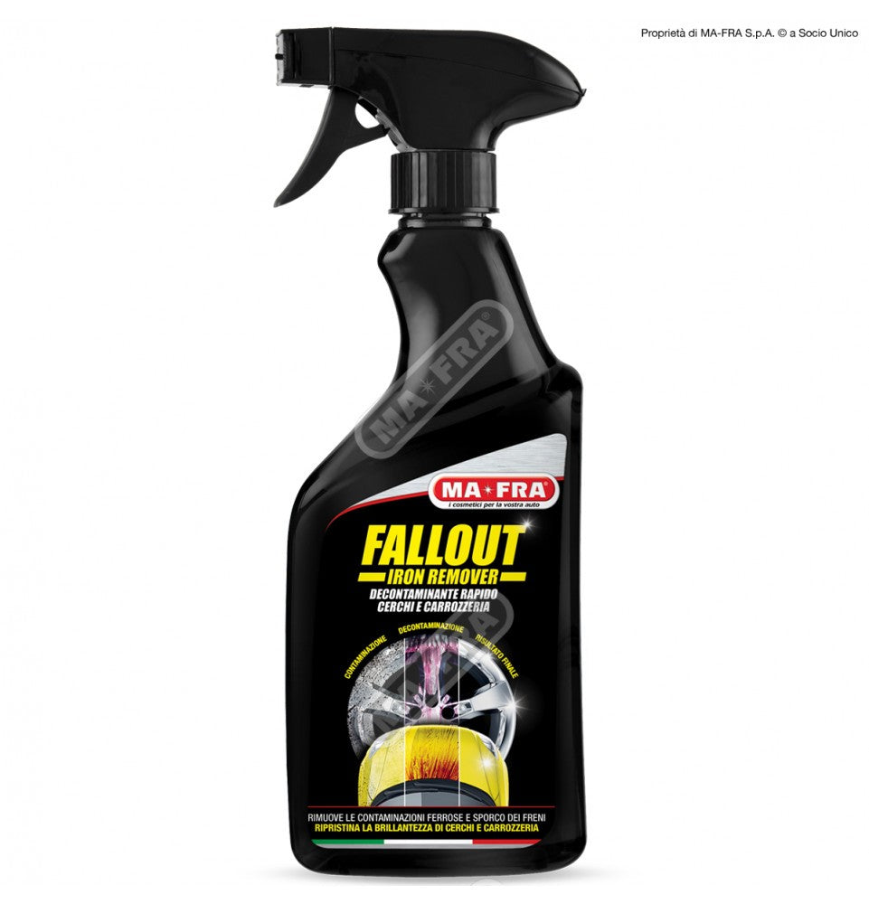 Mafra Fallout Iron Remover 500ml è un innovativo prodotto specifico per eliminare le contaminazioni ferrose più ostinate su carrozzeria e cerchi, che i normali detergenti non riescono a rimuovere. Grazie alla sua formula priva di acidi e dal pH bilanciato, agisce efficacemente su cerchi in acciaio, lega leggera, cromati e lucidati, dissolvendo chimicamente i residui ferrosi penetrati nella vernice.