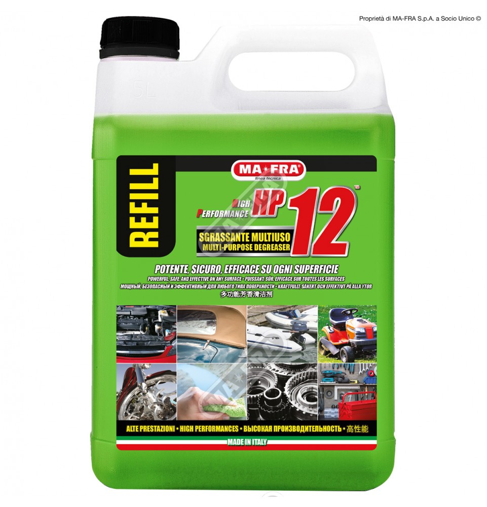 Mafra HP12 4500 ml è uno sgrassatore universale professionale, ideale per la pulizia profonda e sicura di auto, moto, camper e superfici domestiche. Grazie alla sua formula avanzata, rimuove efficacemente sporco ostinato, grasso, traffic film e smog, proteggendo tutte le superfici trattate.