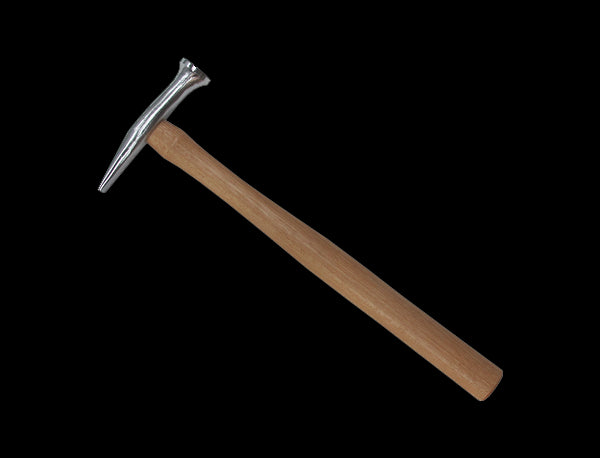 martello per carrozzeria perfettamente bilanciato, realizzato in acciaio di alta qualità, con punta tonda e becco appiattito a forma di cuneo perpendicolare al manico. impugnatura in legno massiccio, che garantisce l'assenza di vibrazioni e un effetto anti-rimbalzo.