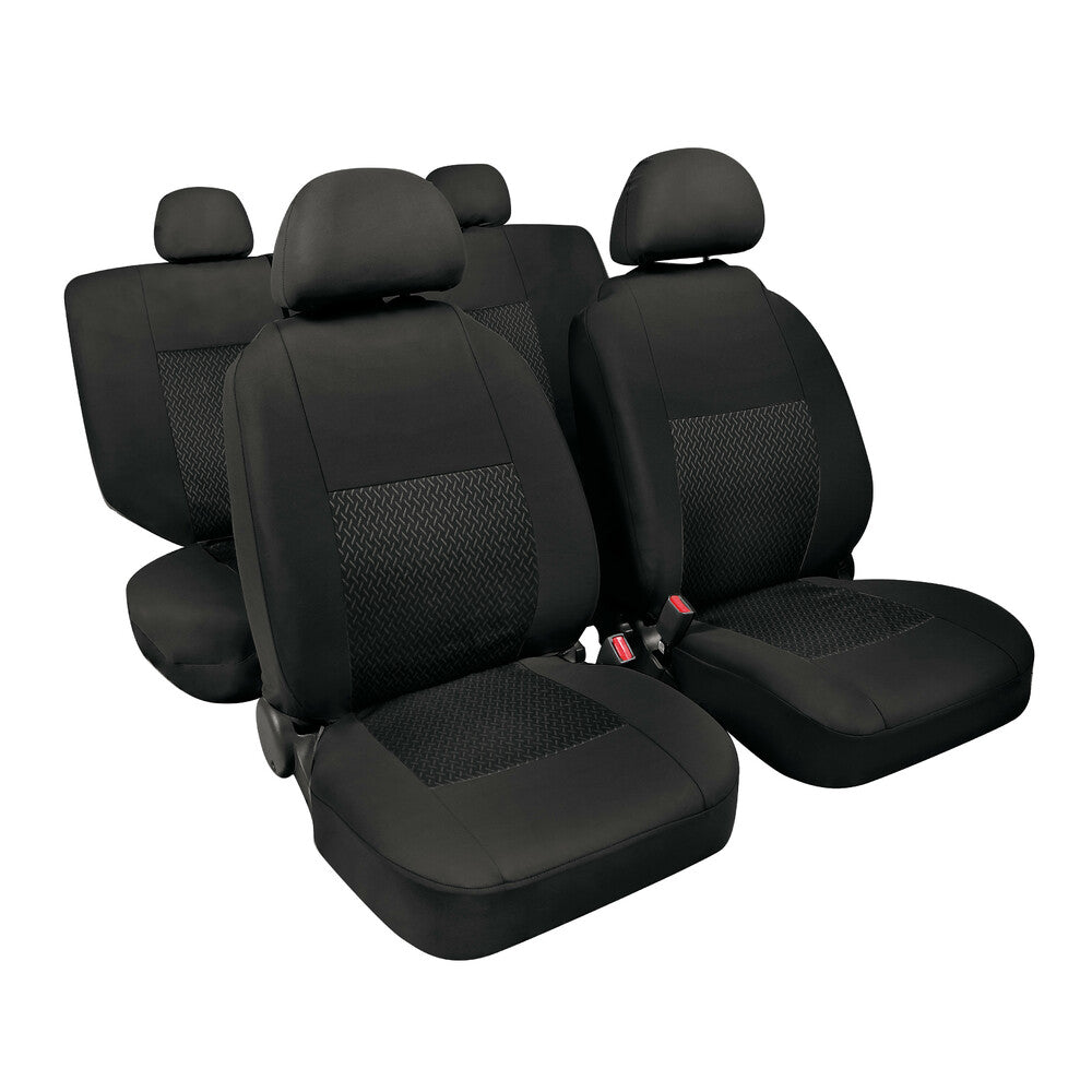 Il set Lampa Linear comprende 4 pezzi di fodere coordinate in tessuto jacquard di alta qualità, di colore nero elegante, perfette per rinnovare l'interno della tua vettura. Il set include 2 fodere per sedili anteriori, 2 per sedili posteriori con 2 pratiche cerniere, e 4 copripoggiatesta. Realizzate in robusto tessuto poliestere con imbottiture in spugna morbida, sono studiate per adattarsi in modo universale alla maggior parte delle vetture con sedili standard.