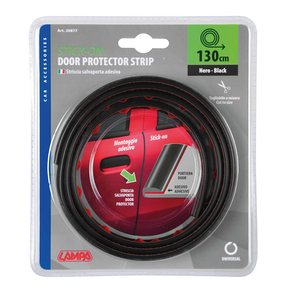 La striscia salvaporta Lampa è realizzata in materiale resistente, di colore nero, che offre un'ottima protezione senza alterare l'estetica dell'auto. Grazie al suo adesivo a contatto di alta qualità, la striscia si monta facilmente sulle portiere mantenendo una presa salda anche a temperature estreme, sia alte che basse. Può essere sagomata e tagliata per aderire perfettamente a qualsiasi forma, rendendola versatile e personalizzabile.