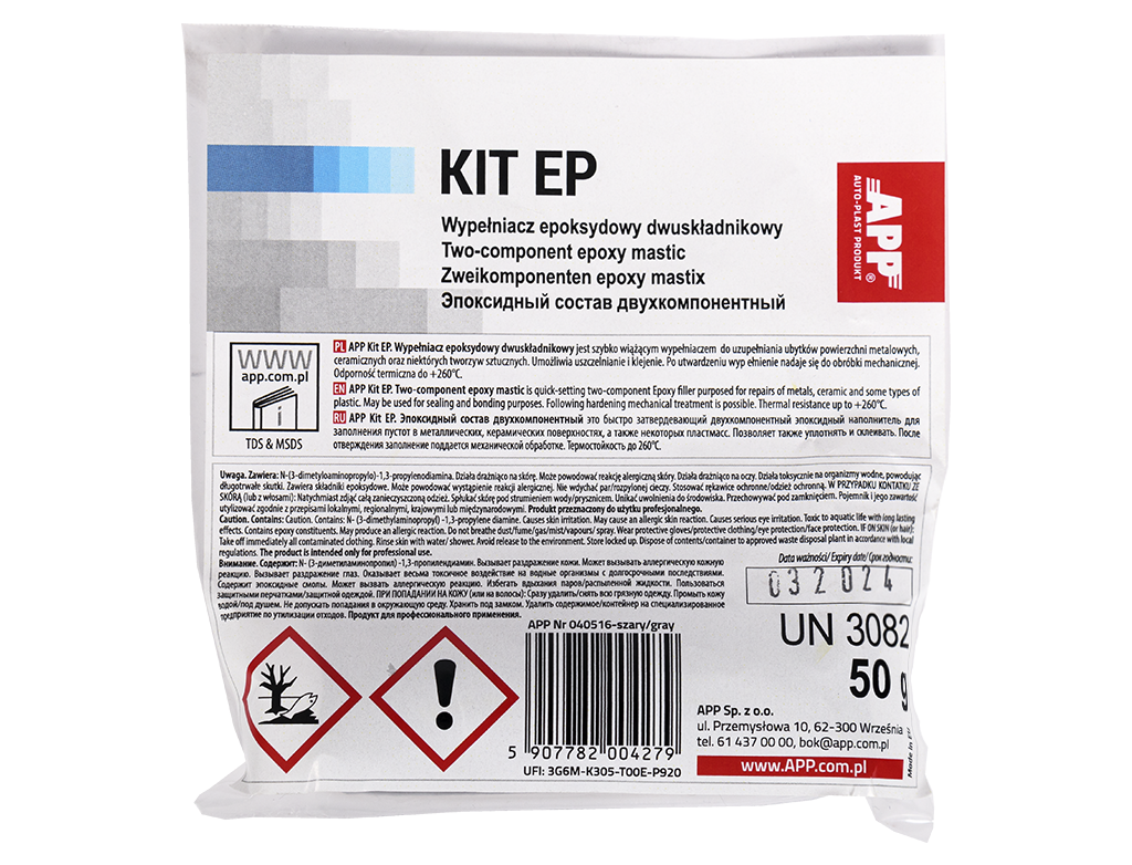 APP KIT EP 1K epoxy filler è un kit riparativo a base di resina epossidica bicomponente che consente di riempire difetti superficiali, sigillare e incollare con rapidità ed efficacia. Dopo l'indurimento, il materiale diventa meccanicamente lavorabile e offre una superficie durevole e resistente, adatta a molte applicazioni di riparazione.