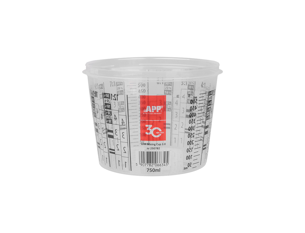 contenitori in plastica resistenti ai prodotti chimici, ideali per miscelare vernici, smalti, indurenti e diluenti in vari rapporti. dotati di scale graduate precise e aggiunte del 10%, 20% e 30% di diluente per regolare la viscosità della miscela.